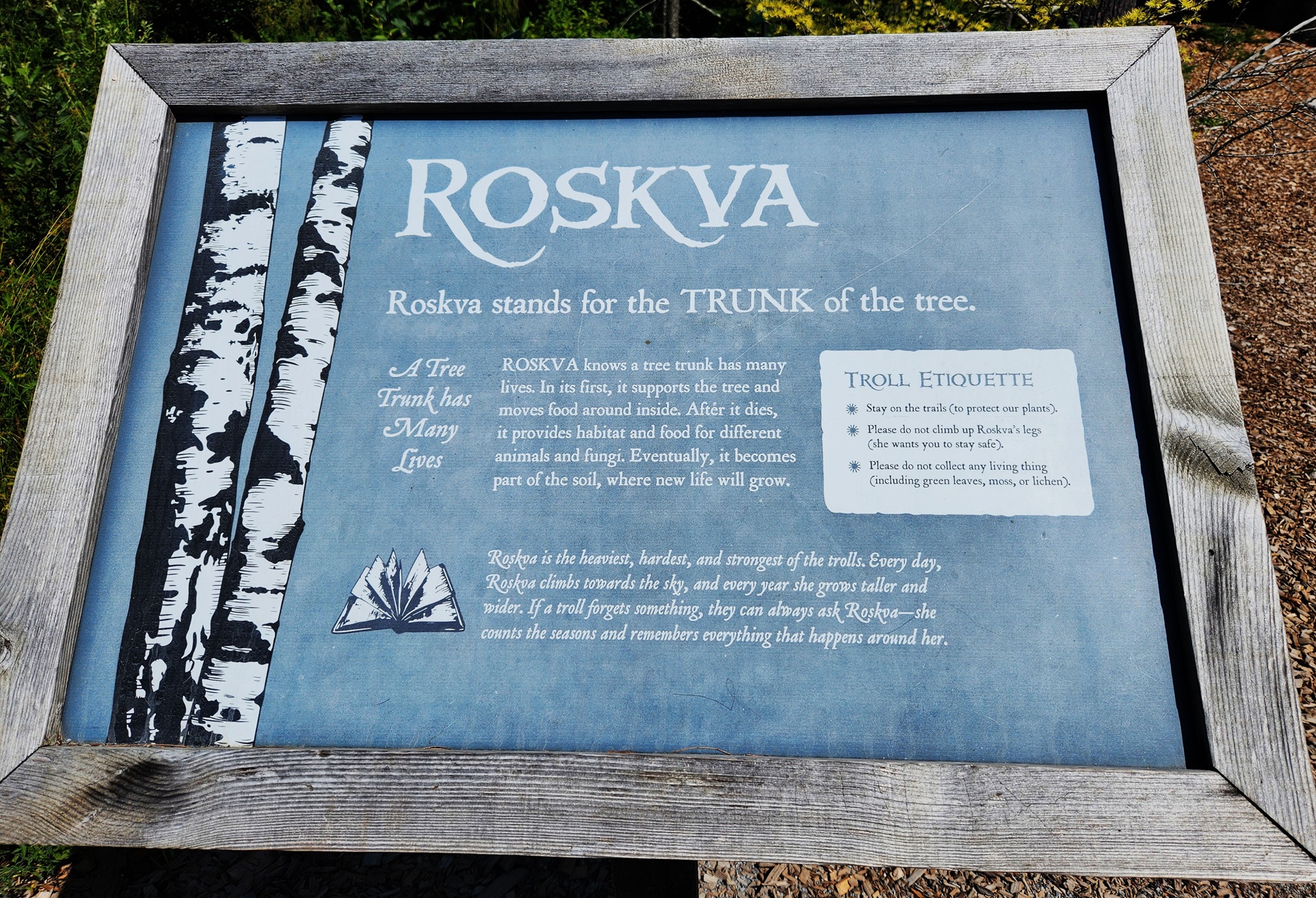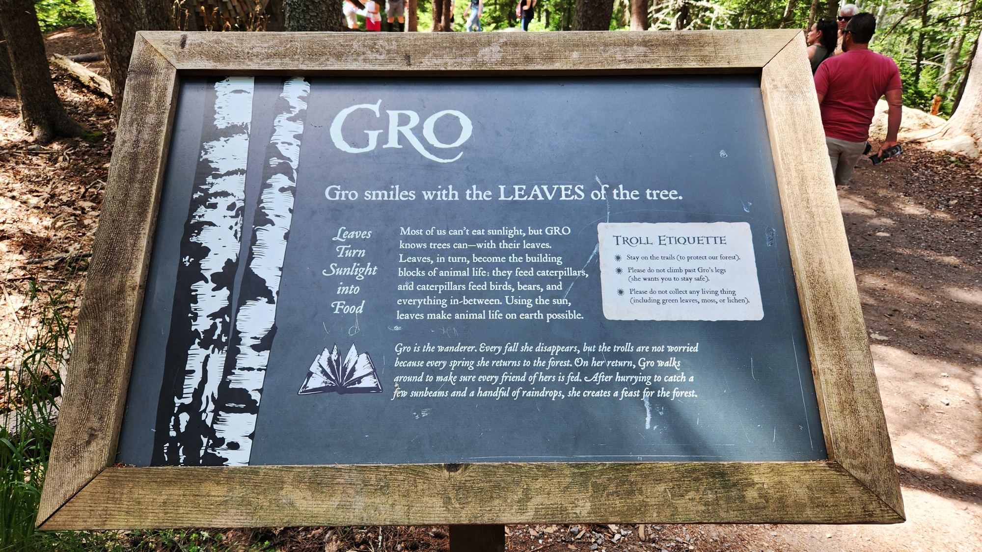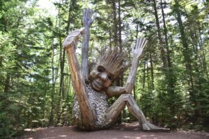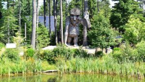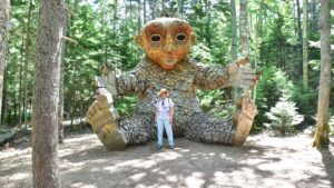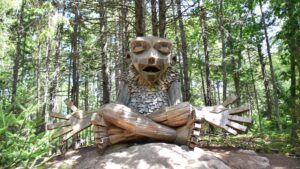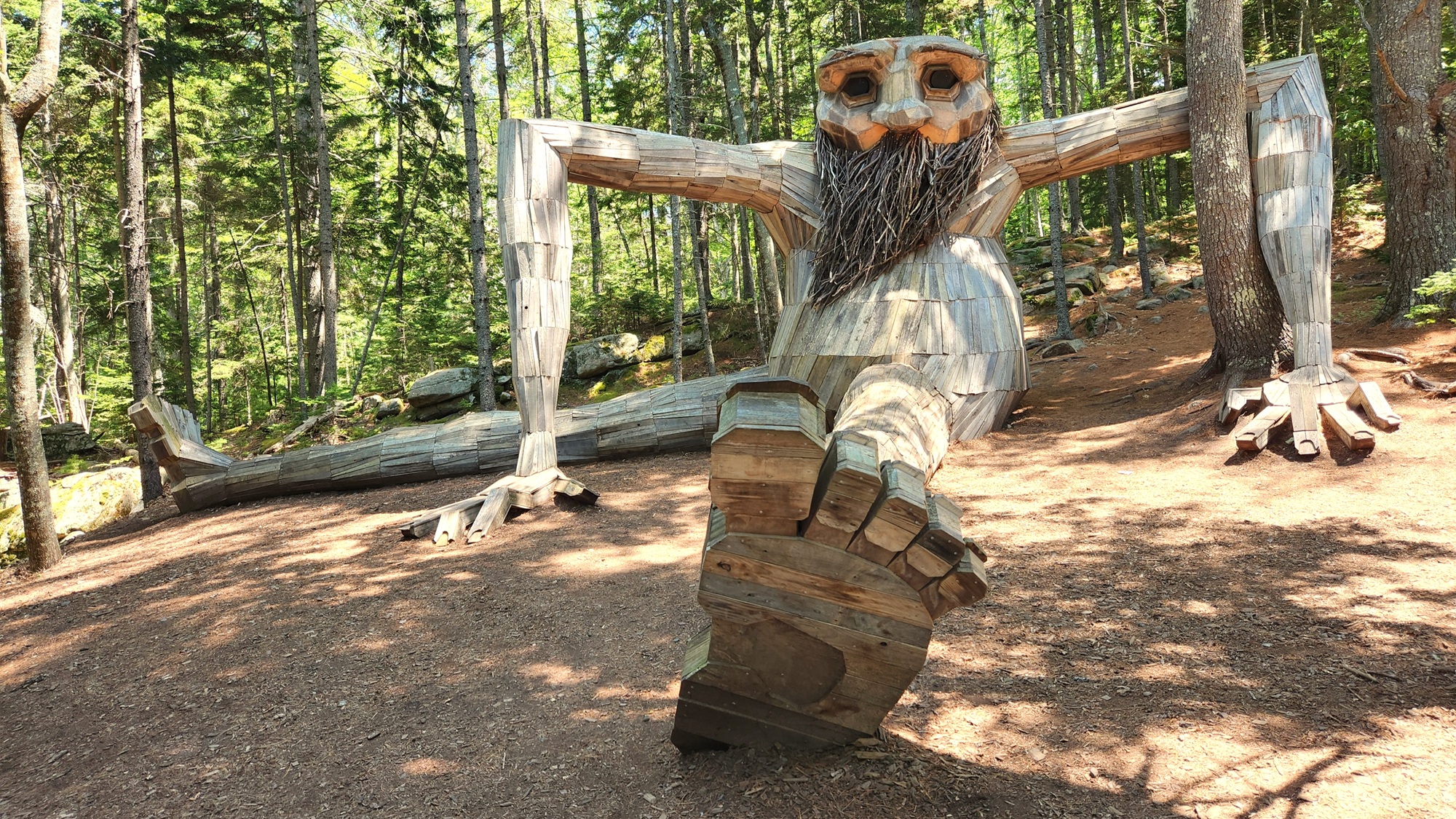 The Coastal Maine Botanical Gardens are a few miles away from Boothbay, and have the usual beautiful flowers, woodlands, trails, etc., but the main reason we wanted to go there was to see the 5 troll statues. Here is how they are described: Created by acclaimed Danish artist Thomas Dambo, the exhibit, titled “Guardians of the Seeds,” showcases five massive trolls, each made from reclaimed wood and cleverly hidden throughout the garden’s 300-acre landscape. Standing between 15 and 30 feet tall, these trolls act as guardians of nature.