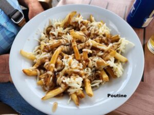 Headed back at the end of the day, the fog lifted and we found an ocean-view restaurant for drinks and a snack of something new: poutine. Not too bad, but probably won’t be something that we order often!