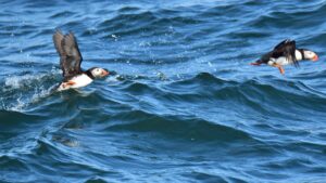 Whales and Puffins were the object of our next boat tour, for 5 hours this time, and out of Boothbay. The whales did not cooperate and failed to make an appearance, but the Puffins were more accommodating. The tour moderator likened them to bumblebees, and that is kind of what they reminded us of. They are small, round and fast, making picture taking difficult, but Bruce managed to snap a few.